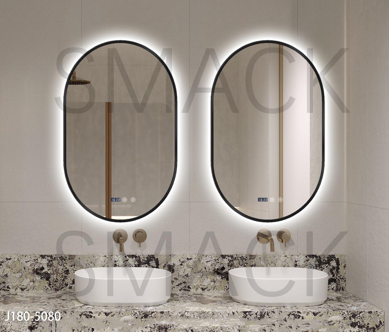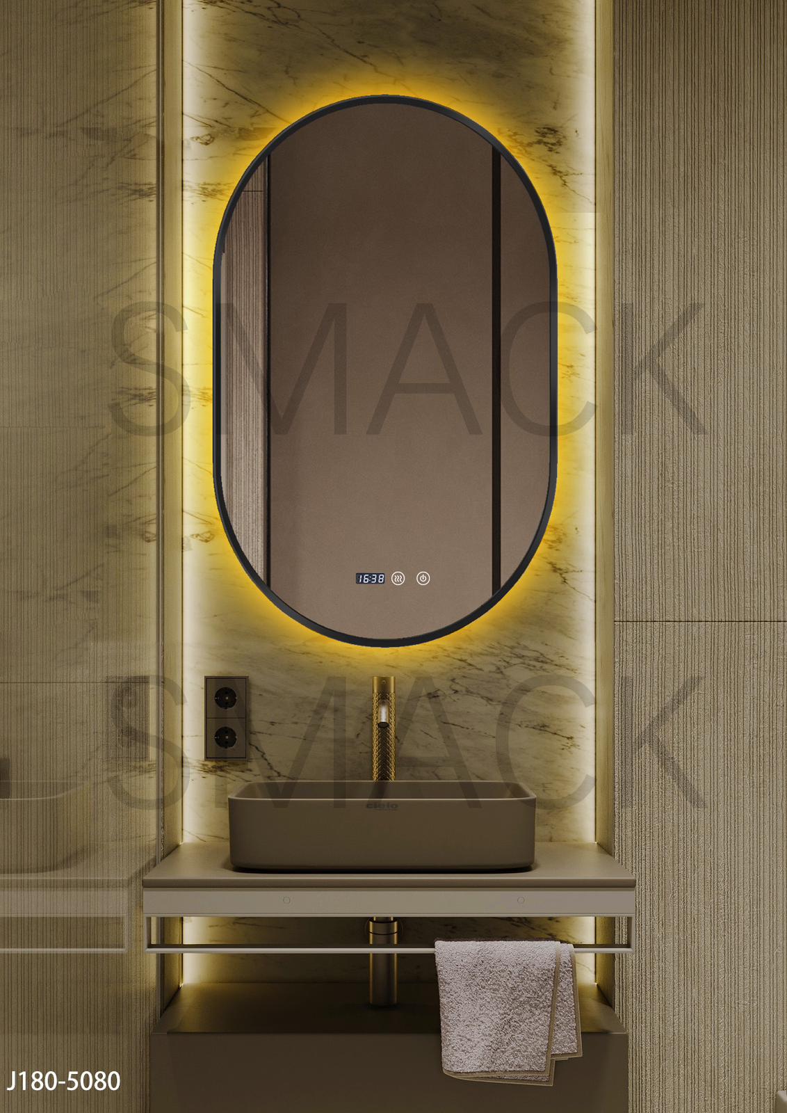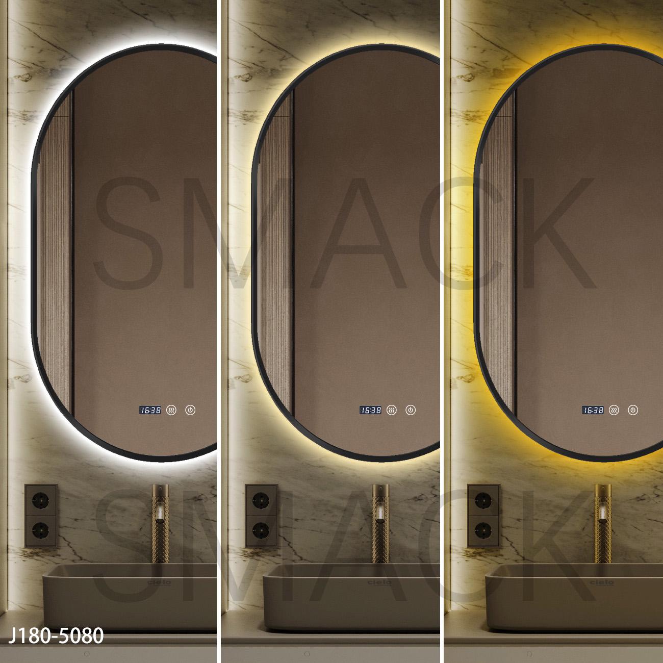 Oglinda LED si Touch, cu Functie Dezaburire si Ceas, 3 Tipuri De Lumina, Rama Negru Mat, 50 x 80 cm, Smack