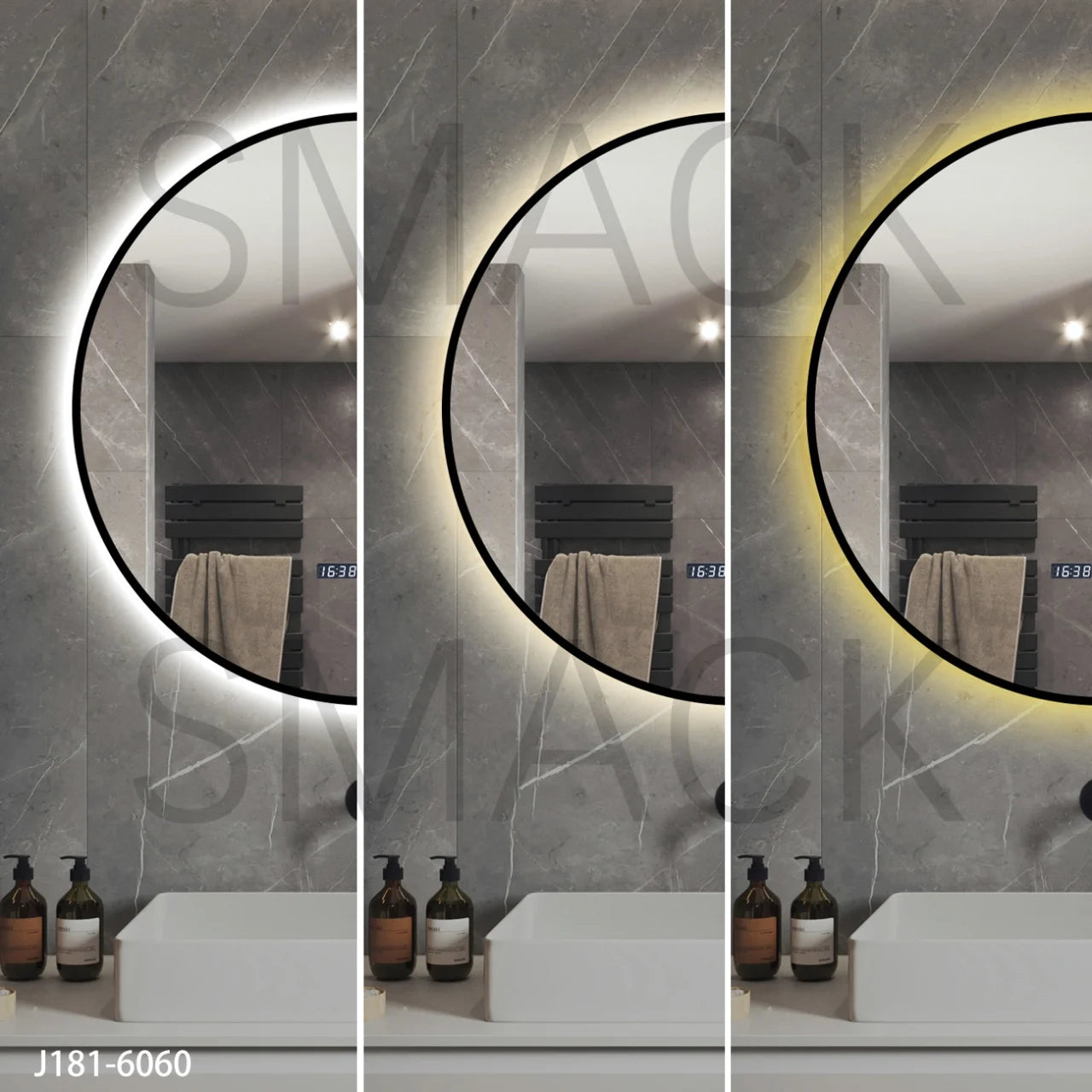 Oglinda LED si Touch, cu Functie Dezaburire si Ceas, 3 Tipuri De Lumina, Rama Negru Mat, 60 cm, J181-60 Smack